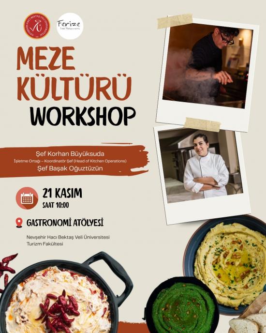 Nevşehir Hacı Bektaş Veli Üniversitesi Turizm Fakültesi Gastronomi ve Mutfak Sanatları Bölümü, Soğuk Mutfak dersi kapsamında 3. sınıf öğrencilerine özel bir workshop düzenliyor. Meze kültürünün zengin dünyasını keşfetmek üzere düzenlenen bu uygulamalı etkinlikte, alanında deneyimli şefler Korhan Büyüksuda ve Başak Oğuztüzün öğrencilerle bir araya gelecek.