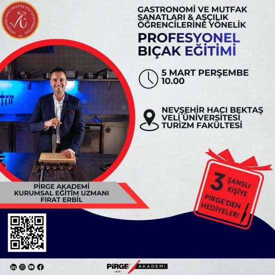 Gastronomi ve Mutfak Sanatları öğrencilerine özel olarak düzenlenen Profesyonel Bıçak Eğitimi, sektörün deneyimli ismi Pirge Akademi Kurumsal Eğitim Uzmanı Fırat Erbil’in katılımıyla gerçekleştirilecektir.